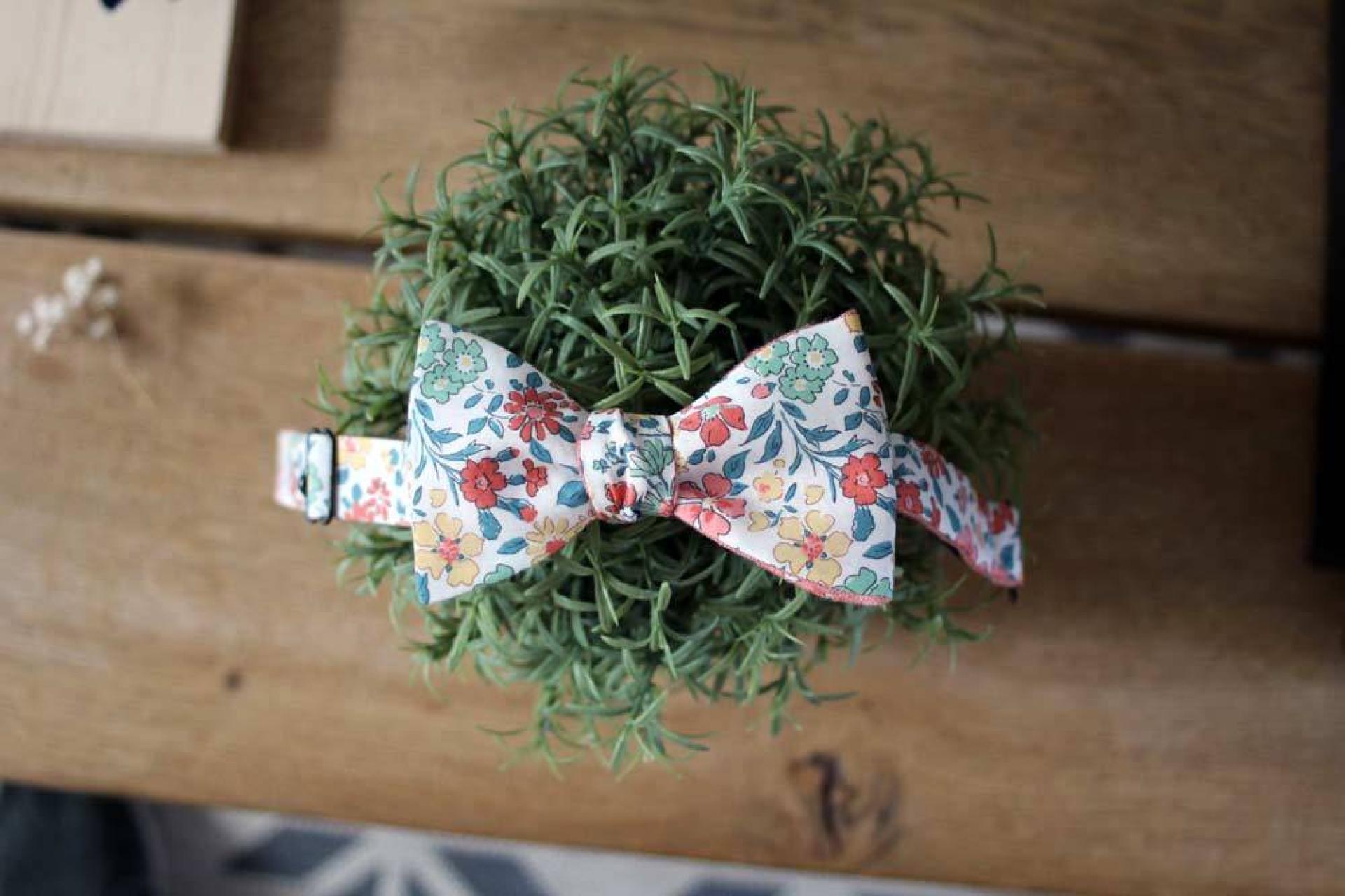 Associez un nœud papillon liberty à une chemise blanche pour un look moderne et décontracté.